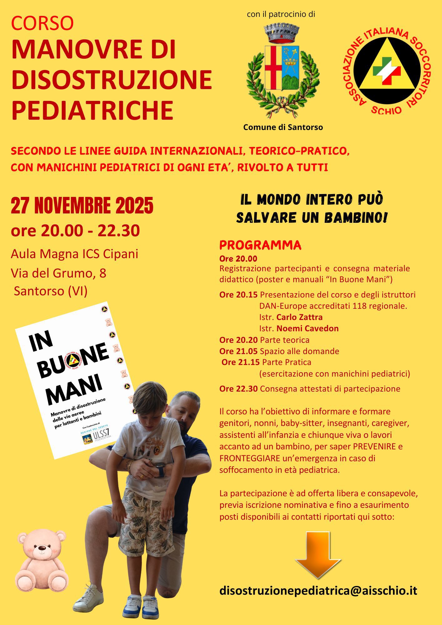 Cos'è Corso rivolto a tutti gratuitoPartecipazione libera fino ad esaurimento posti disponibiliper INFO e iscrizioni disostruzionepediatrica@aisschio.it