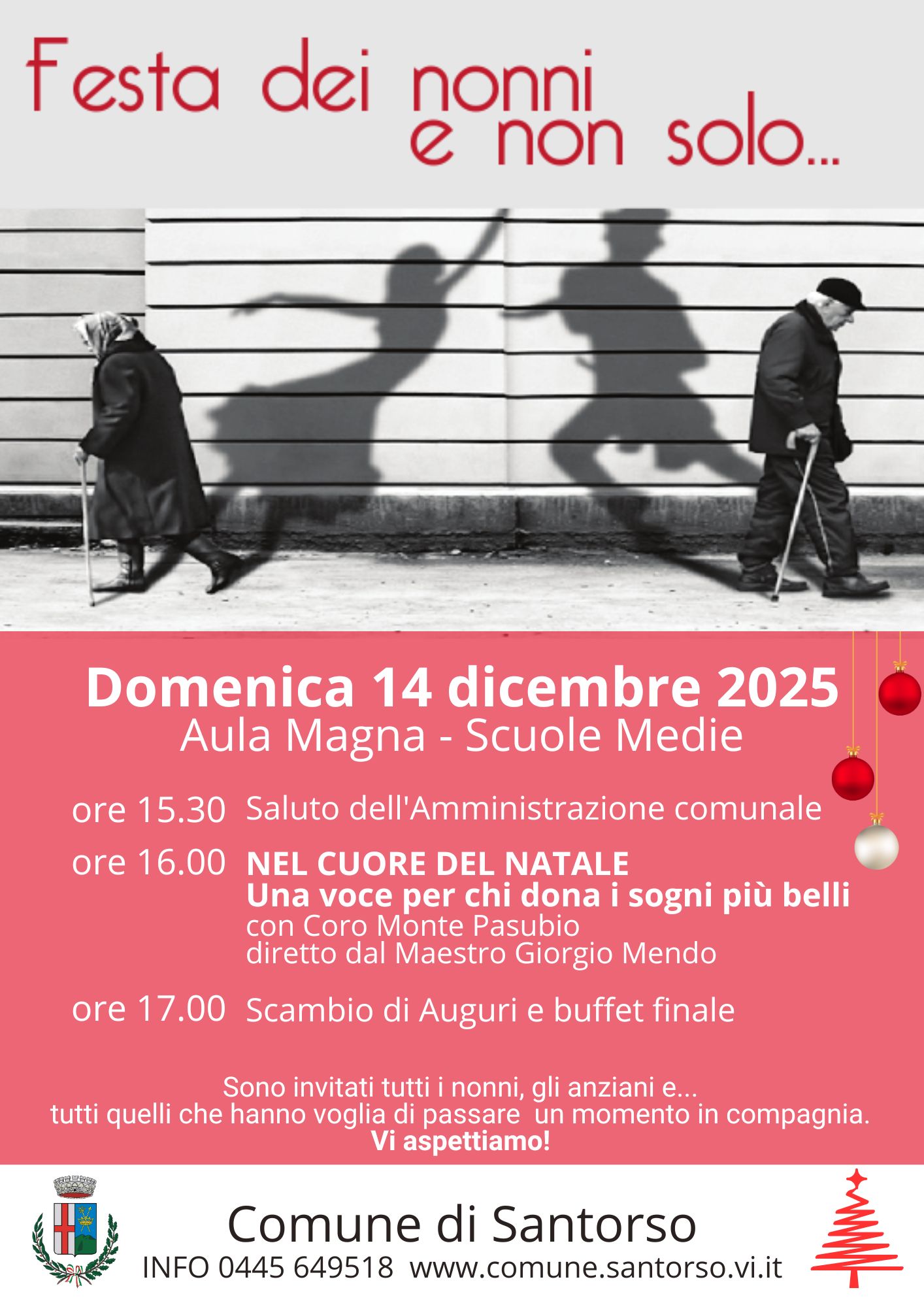 Festa dei nonni e non solo...Domenica 14 dicembre 2025Aula Magna - Scuole Medieore 15.30 Saluto dell'Amministrazione comunaleore 16.00 Nel cuore del Natale. Una voce per chi dona i sogni più belliConcerto con Coro Monte Pasubio Schiodiretto dal Maestro Giorgio MendoScambio di Auguri e buffet finale