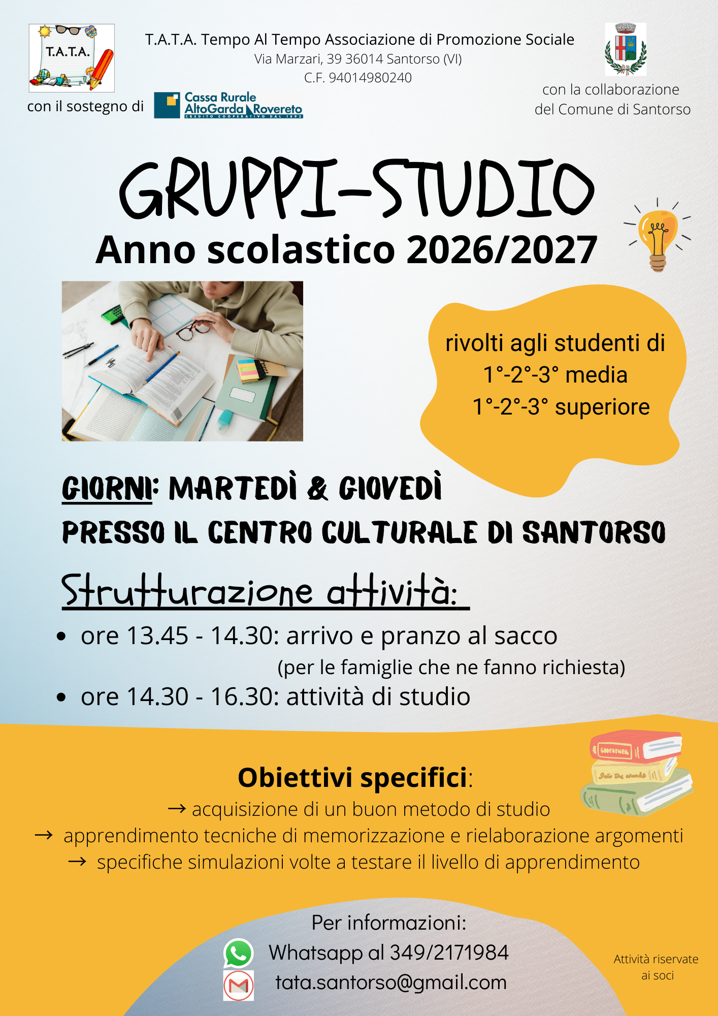Aperte le le pre-iscrizioni ai “Gruppi-Studio” pomeridiani organizzati dall' Associazione TATA presso gli spazi del Centro Culturale di Santorso.