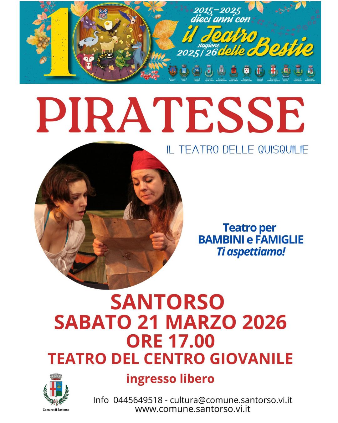 PIRATESSEcon Il teatro delle QuisquiliePer bambini dai 4 anni e famiglieSi parla spesso di pirati, ma… Le piratesse?!? Saranno mai esistite? Ebbene sì! Arabella Drummond, detta “il Terrore dei mari”, e Anne Bonney furono due piratesse molto conosciute.Da qui nasce la storia di due amiche, Arabella e Anna, che, giocando in soffitta, trovano una mappa del tesoro e, un po’ per magia e un po’ per fantasia, si ritrovano in mezzo al mare, su una nave che le porterà dritte sull’isola indicata dalla mappa. Alla fine della loro avventura, si renderanno conto che i tesori, quelli veri, non sono fatti né d’oro né di argento, ma… ti vogliono bene, si possono abbracciare, e si devono custodire e coltivare nel tempo.